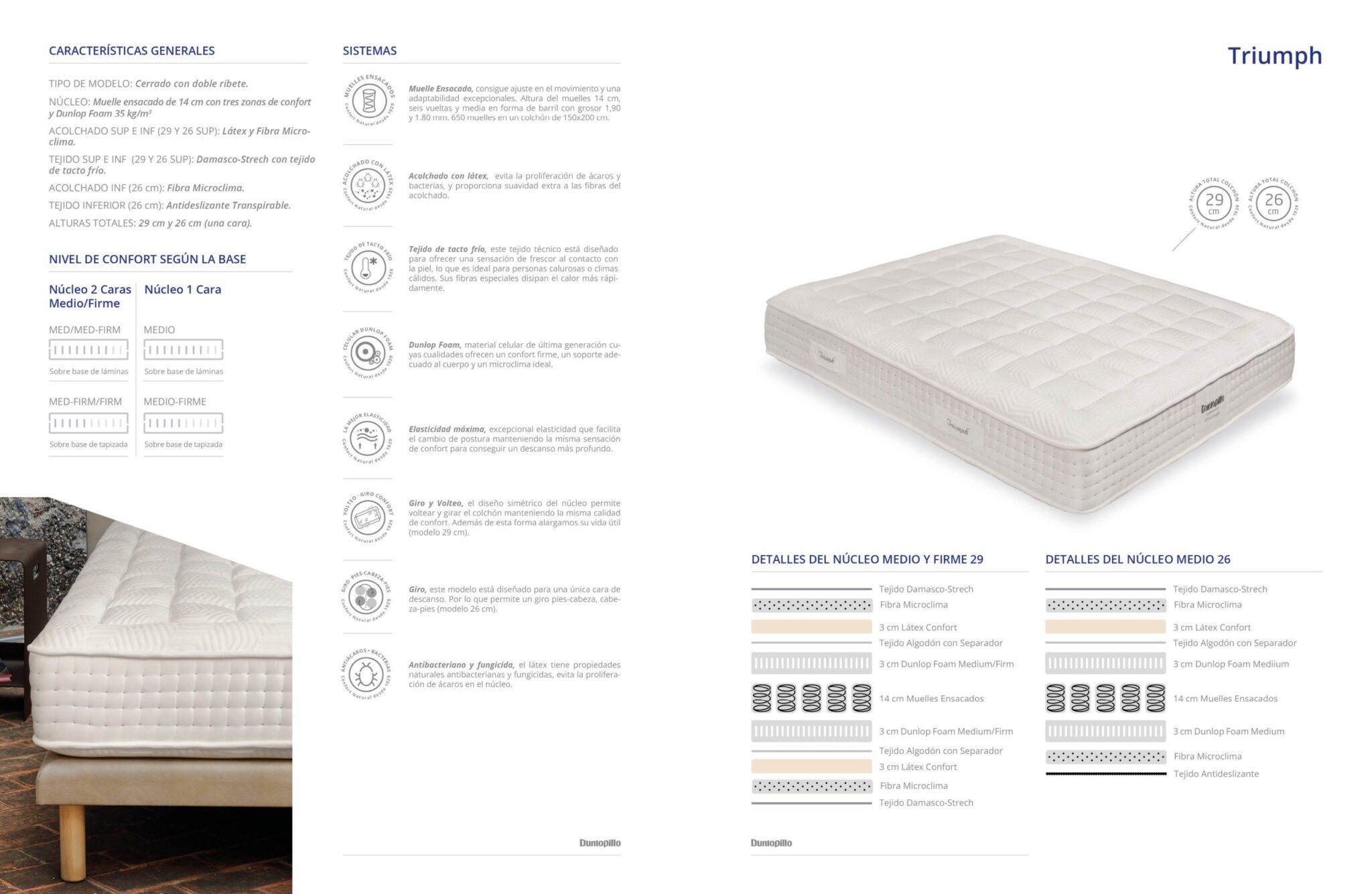 El núcleo de muelles ensacados aporta soporte independiente, alta transpirabilidad y ergonomía.