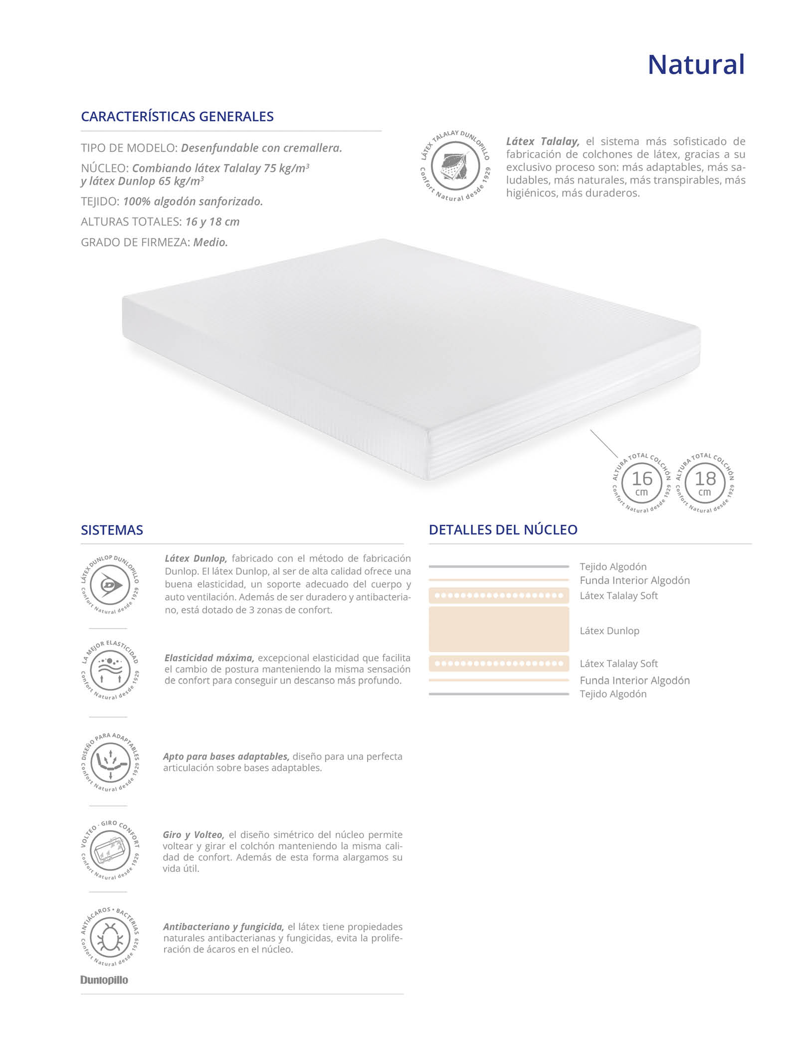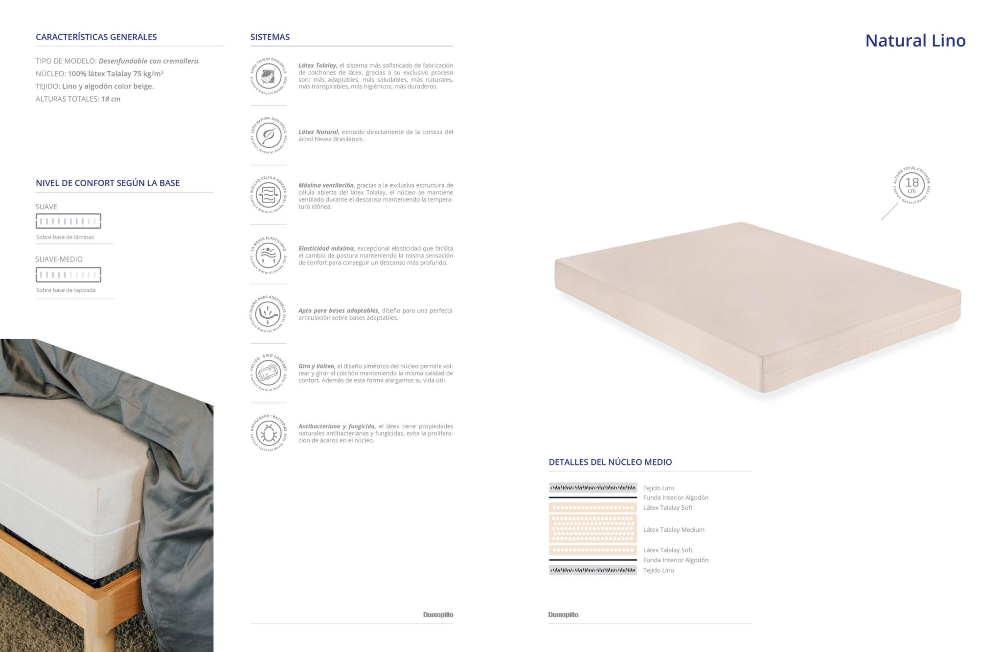 Núcleo combinado de látex Talalay y látex Dunlop que proporciona excelente adaptabilidad con mínima presión.
